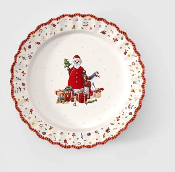 Grandiózus süteményes tál Télapó mintájával A Villeroy & Boch Toy’s Delight porcelán karácsonyi szettje maga a megtestesült báj. Az apró, nosztalgikus játékmintákkal tarkított készlet minden darabjáról sugárzik a boldogság. A gömbölyded formák és a cakkos szélű tányérok egymással nagyszerű egységet alkotnak a terített asztalon, de önmagában is mutatós minden darab. A sorozat hangulatát a klasszikus karácsonyi színek, így a piros, zöld és fehér adja, míg motívumai közt fellelhető a Télapó, a hintaló, a csillag, a fagyöngy, az őzike és a piros masnis ajándékdoboz is. Az egyes darabokon megjelenő, piros és arany gömbökkel díszített dundi karácsonyfa ábrája még inkább emeli a készlet ünnepies mivoltát, ami a karácsonyt megelőző és az azt követő téli időszakban mindvégig melegséggel tölti el a szíveket. A kollekció nagy méretű, öblös kialakítású kínálótálja már önmagában is roppant mutatós a közepén lévő Télapó mintájával, de gyümölcsökkel, süteménnyel vagy egyéb finomságokkal maga a megtestesült karácsonyi hangulatvarázsló. Az enyhén cakkos peremű tál mindenütt jól mutat: az étkezőasztalon, a nappaliban vagy épp szegfűszeggel tűzdelt narancsokkal megpakolva a fa alatt. Lelje örömét és gyönyörködjön a Toy's Delight kollekció szépségében!